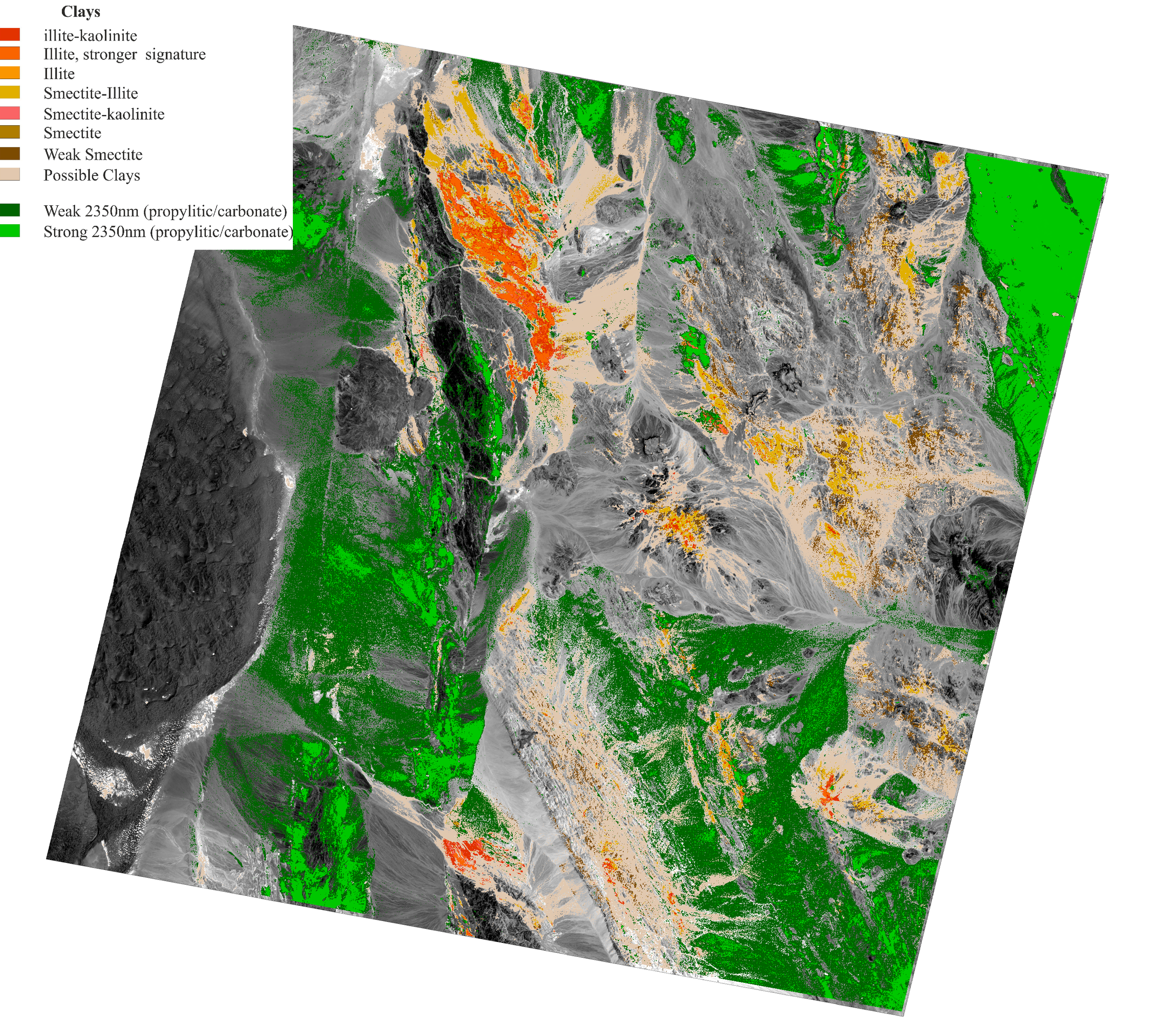 Target Identification: Key indicator minerals such as carbonates, muscovite, illite, smectite, kaolinite, iron oxides, and silica were identified through spectral analysis and combined with other mapped indicator features, including lineaments.